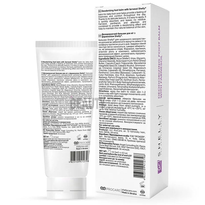 Дезодорирующий бальзам для ног Shelly с фарнезолом – эффективное средство для ежедневного ухода за кожей стоп, склонной к чрезмерному потоотделению, появлению неприятного запаха и раздражений. Формула бальзама обладает антисептическим и бактерицидным действием, помогает предотвратить развитие грибковых инфекций, поддерживает здоровое состояние кожи и способствует заживлению трещин. Средство помогает сохранять ощущение свежести в течение всего дня, обеспечивая комфорт и ухоженный вид кожи..