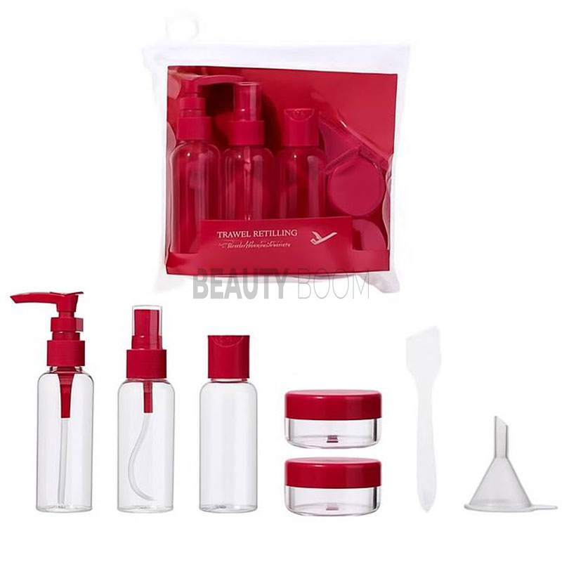 В комплекте: 2 бутылочки с дозаторами (спрей и насос) по 30 мл, 1 бутылочка с крышкой 30 мл, 2 баночки для кремов, 1 ложечка, прозрачная косметичка.