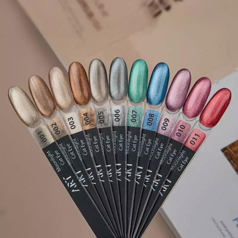 ART Moonlight Cat Eye — коллекция магнитных гель-лаков с эффектом кошачьего глаза, создающая сияющую глубину и невероятные переливы. Уникальная формула с высокой концентрацией металлических частиц позволяет легко сформировать желаемый эффект с помощью магнита.