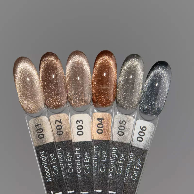ART Moonlight Cat Eye — коллекция магнитных гель-лаков с эффектом кошачьего глаза, создающая сияющую глубину и невероятные переливы. Уникальная формула с высокой концентрацией металлических частиц позволяет легко сформировать желаемый эффект с помощью магнита.