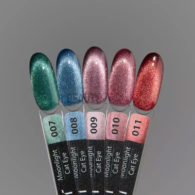 ART Moonlight Cat Eye — коллекция магнитных гель-лаков с эффектом кошачьего глаза, создающая сияющую глубину и невероятные переливы. Уникальная формула с высокой концентрацией металлических частиц позволяет легко сформировать желаемый эффект с помощью магнита.