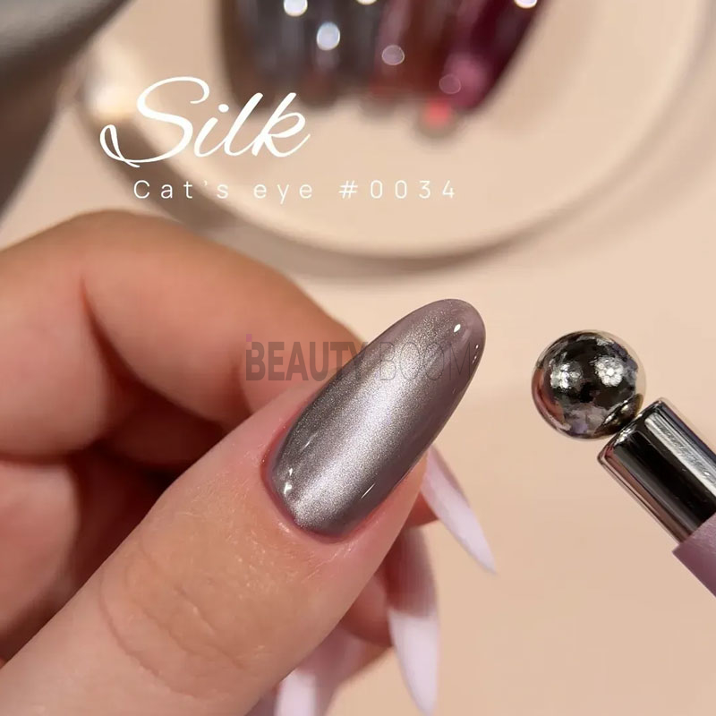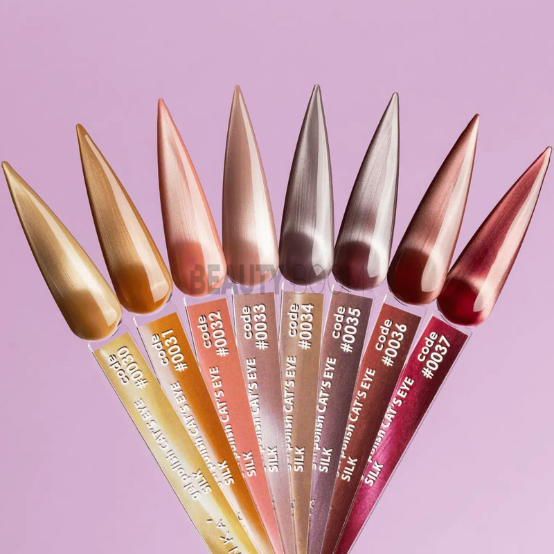 Каждый оттенок Cat Eye Silk – чувствителен к магниту и одновременно хорошо держит созданный эффект, позволяющий создавать различные современные узоры для процесса полимеризации.