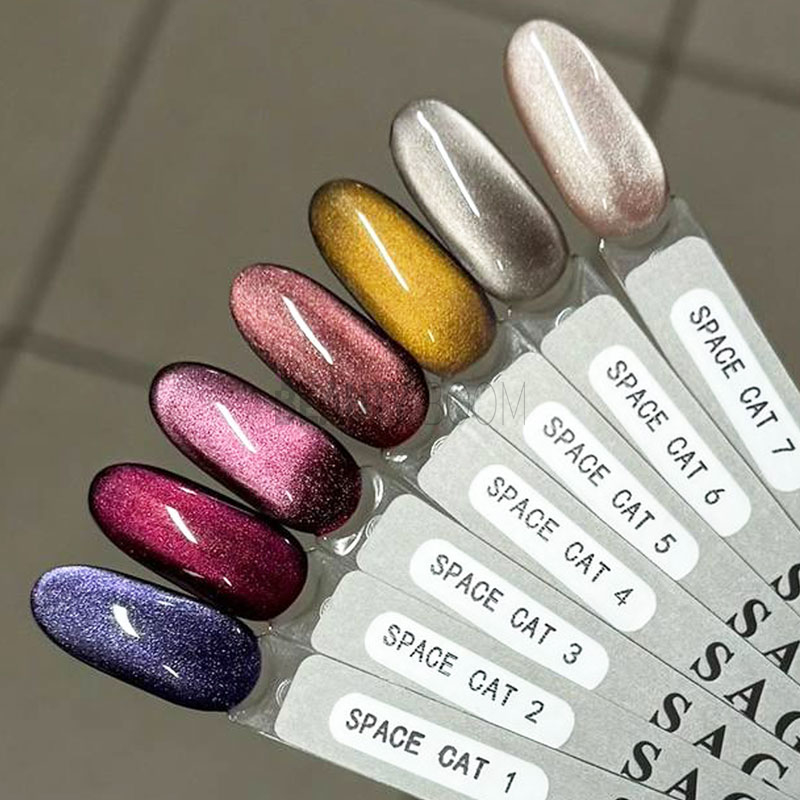Saga Professional Space Cat – роскошная и уникальная коллекция плотных сияющих гель-лаков с эффектом "кошачьего глаза". Цвета просто невероятны по глубине, красоте и блеску! Под действием магнита, который можно преподносить с разных сторон, легко формируется волшебный отблеск, и маникюр приобретает просто фантастический вид.