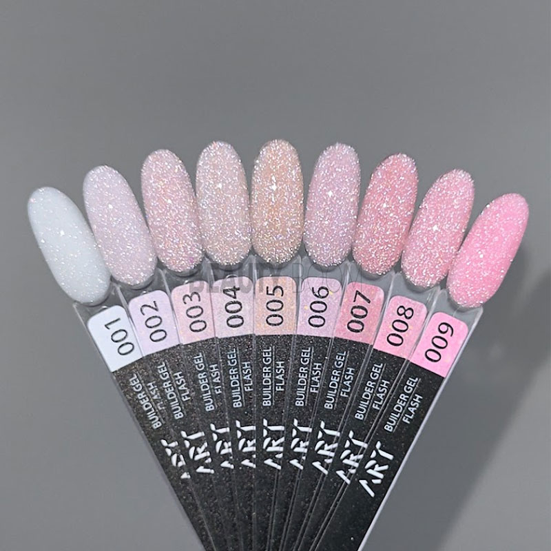 ART FLASH Builder Gel — світловідбиваючі камуфлюючі гелі для моделювання та укріплення нігтів, які поєднують міцність, комфорт у роботі й неймовірне сяйво завдяки світловідбиваючим блискіткам. FLASH Builder Gel підходить для будь-якої техніки, а завдяки своїй консистенції та в’язкості ним можна працювати без опилу, що забезпечує комфорт та економію часу. Гелі підходять для роботи з паперовими формами, верхніми формами, а також для укріплення натурального нігтя або корекції.