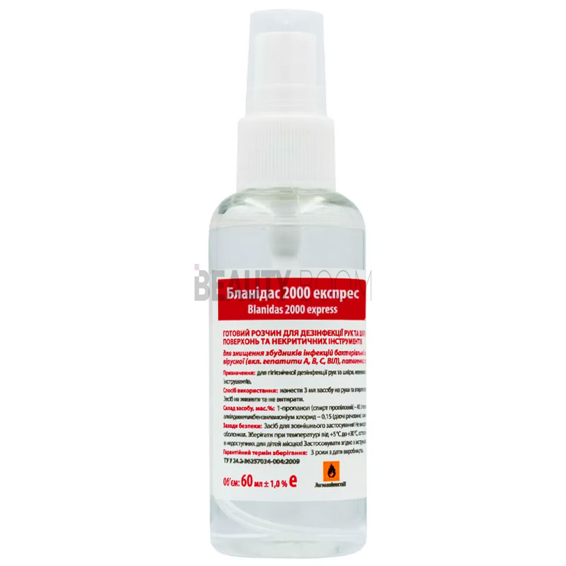 Бланідас 2000 експрес - ефективний і безпечний дезинфікуючий засіб тривалої дії для рук, ніг, шкіри, поверхонь, виробів медичного призначення. Знищує бактерії (включаючи туберкульоз), віруси (включаючи гепатити, ВІЛ, віруси грипу), грибки. Використовується для профілактичної обробки ніг від грибкових інфекцій.