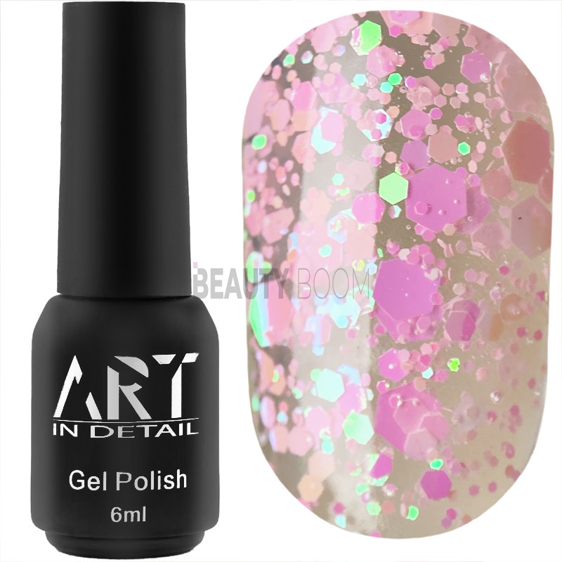 ART Confetti - колекція гель-лаків на прозорій основі з яскравими шестигранниками, що переливаються. Колекція ідеально підійде для літніх та яскравих дизайнів. Як підложку можна використовувати кольорові гель-лаки або бази, а також нанести самостійно, покриваючи в два тонкі шари.