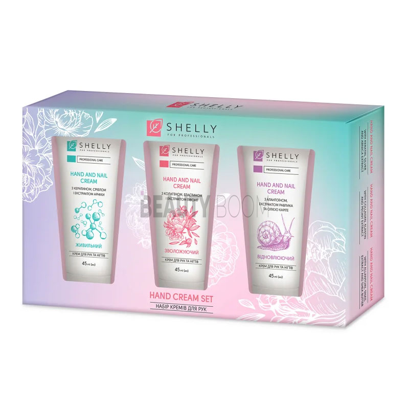 Подаруйте своїй шкірі зволоження та ніжність з набором кремів для рук від Shelly™! Набір включає три засоби: живильний крем з кератином, сріблом і екстрактом арніки; пом'якшуючий крем з колагеном, еластином і екстрактом півонії; відновлюючий крем з алантоїном, екстрактом равлика та олією каріте. Креми мають легку консистенцію, швидко вбираються. Оптимальний склад поживних елементів допомагає підтримувати епідерміс у здоровому та доглянутому стані.
