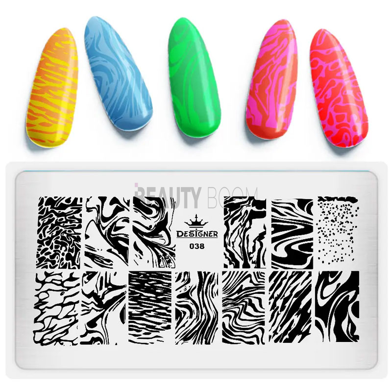Пластина виготовлена із міцного металу. Вона гладка і блискуча, що дозволяє наносити високоточні малюнки з ідеальним опрацюванням навіть найдрібніших деталей малюнка. Малюнки можна комбінувати, наносити їх різними кольорами лаків, додавати стрази, перли, бульйонки та будь-які інші декоративні елементи.
