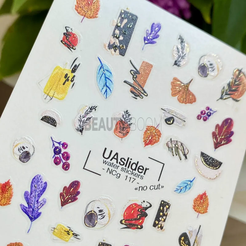 Слайдери серії NCg не потрібно вирізати, вони вже без зайвої плівки, плівка є лише по формі зображення. Достатньо розмочити слайдер або попередньо вирізану групу елементів на вологій серветці 10 сек. Пензликом змоченим в гелевій базі, так щоб він був липкий, переносимо малюнок на ніготь. Закріплюються такі слайдери так само як звичайні.