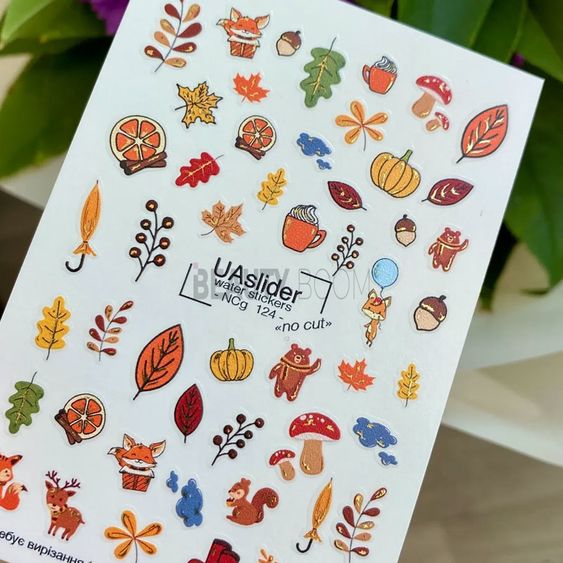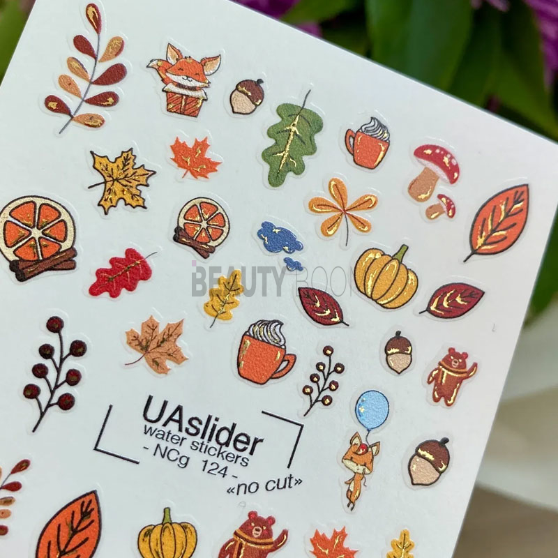 Слайдери серії NCg не потрібно вирізати, вони вже без зайвої плівки, плівка є лише по формі зображення. Достатньо розмочити слайдер або попередньо вирізану групу елементів на вологій серветці 10 сек. Пензликом змоченим в гелевій базі, так щоб він був липкий, переносимо малюнок на ніготь. Закріплюються такі слайдери так само як звичайні.