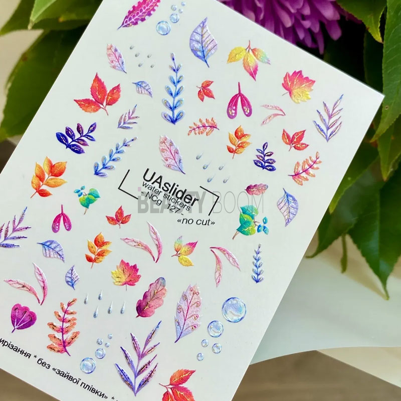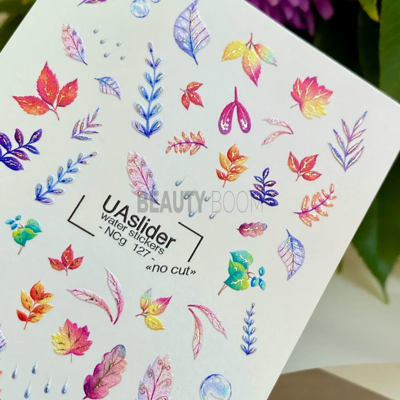 Слайдери серії NCg не потрібно вирізати, вони вже без зайвої плівки, плівка є лише по формі зображення. Достатньо розмочити слайдер або попередньо вирізану групу елементів на вологій серветці 10 сек. Пензликом змоченим в гелевій базі, так щоб він був липкий, переносимо малюнок на ніготь. Закріплюються такі слайдери так само як звичайні.