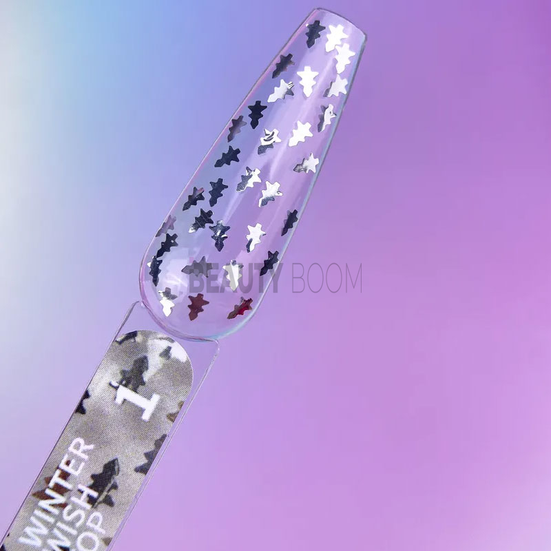 Top Winter wish №1 - це топ з сріблястими ялинками, без липкого шару, який буде гармонійно виглядати з будь-яким кольором на нігтях. Він здатний зробити ваш манікюр цікавим та незвичайним.