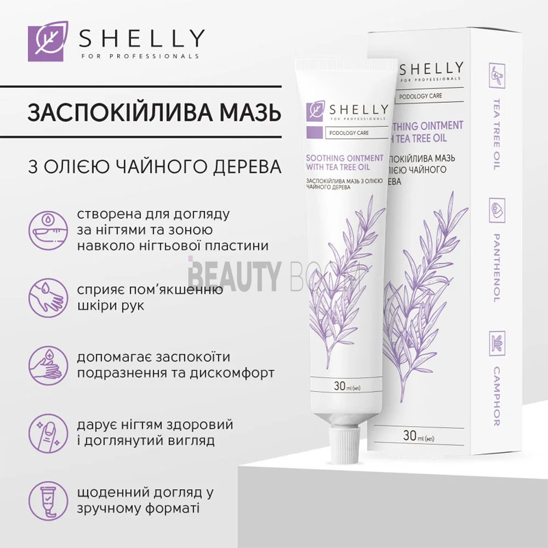 Успокаивающая мазь с маслом чайного дерева от Shelly – профессиональное средство для ухода за ногтями и кожей вокруг ногтевой пластины. Формула разработана для смягчения, успокоения и поддержания здорового состояния ногтей и околоногтевой зоны, в частности при повышенной чувствительности, раздражении или дискомфорте.